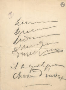 Brouillon autographe pendant une représentation de La Dame aux camélias d’Alexandre Dumas fils. Au 2e acte, Marguerite Gauthier devait écrire une réponse à une lettre reçue :...