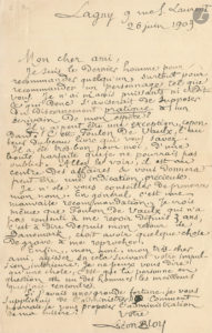 Lagny 26 juin 1903, à un ami. Il ne peut se charger de le recommander : « Je suis le dernier homme pour recommander un personnage tel que...