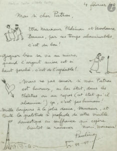 Pauline CARTON (1888-1974). L.A.S. « Pauline » avec dessins, 4 février 1940, à « Mon si cher Patron » [Sacha Guitry] ; 1 page in-4 (petite fente au pli).