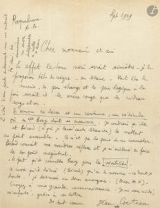 Jean COCTEAU. L.A.S., Roquebrune septembre 1929, [à Émile Fabre, administrateur de la Comédie-Française] ; 1 page in-4.