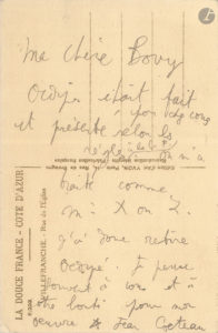 Jean COCTEAU. L.A.S., [vers 1930 ?], à Berte Bovy ; 1 page in-12 au dos d’une carte postale illustrée (Villefranche, Rue de l’Église).
