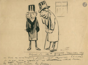 par Henry Somm, dessin à la plume avec légende, au moment du départ de Marthe Brandès (1902).