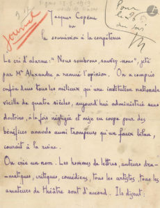 [Jacques COPEAU]. Simone Benda, Mme SIMONE (1877-1983). Manuscrit signé, Jacques Copeau ou la soumission à la compétence, [1929] ; 8 pages petit in-4 à l’encre violette.