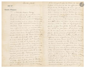 Londres jeudi [18 mai 1871], à Édouard Thierry, administrateur général de la Comédie-Française. [Pendant la Commune, une partie de la troupe est allée jouer à Londres, sous la direction d’Edmond Got.] Coquelin donne des nouvelles : ils ont répété Le Jeu de l’amour et du hasard et Les Fourberies de Scapin. La représentation de L’Aventurière « a été bonne comme effet, la recette était faible, hélas ! 2500, mais le succès valait le triple. Mlle Favart a improvisé ce rôle de la façon la plus remarquable […] Hier l’Avare a fait 3400 F ce n’est pas assez encore, car on doit faire plus. Il est insensé que les autres théâtres fassent bien leurs affaires et que le Théâtre Français ne refuse pas du monde ». Il engage Thierry à venir, et critique vivement le directeur Edmond Got : « Tout le monde est mécontent, et personne ne veut faire de révolution, heureusement ! il ne faut pas donner au peuple anglais le spectacle d’une débandade qui ferait rire de nous et de notre pays, qui nous déconsidérerait […] Toutes les petites jalousies ne sont pas restées à Paris, elles fleurissent aussi bien sur les bords de la Tamise que sur les bords de la Seine, et notre triste métier en a la plus abominable spécialité ». Quant à la situation à Paris, « le cœur me saigne à la pensée de cet effondrement »…
