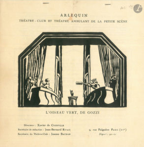 Arlequin, Théâtre-club et théâtre ambulant de La Petite Scène. 2 programmes : L’Oiseau vert, féérie de Gozzi, adaptation de X. de Courville (décembre 1930) ; La Boîte de dragées de X. de Courville, Le Ruban égaré de Mozart, Ariane de Monteverdi, etc. (juin 1931).