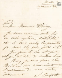 7 décembre 1882 (deuil), réclamant un certain nombre d’objets et de meubles qu’elle a laissés dans son ancienne loge (elle vient de prendre sa retraite) et que sa femme de chambre est venue réclamer en vain…