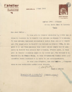 Charles DULLIN.2 L.S. et 1 L.A.S., mai-juillet 1938, à Maître Lévy-Oulmann ; 1 page in-4 chaque à en-tête et vignette de L’Atelier.