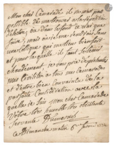 Marie-Françoise Marchand, Mademoiselle DUMESNIL (1713-1803). L.A.S., 6 février 1774, aux semainiers de la Comédie Française, « aux Thuilleries » ; 1 page in-4, adresse.