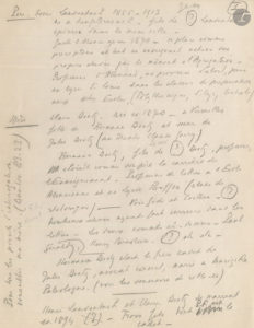 Notes sur son père Henri Laudenbach, originaire d’Alsace, sur sa mère Claire Dietz, sœur de Jules Dietz (au théâtre Claude Garry, dont Fresnay retrace la carrière). Sur sa propre enfance parisienne (rive gauche) et ses études au Lycée Montaigne puis à Henri IV, la mort de son père en 1913 : « Événement d’une douloureuse gravité – grosse influence sur la formation du caractère de PF ». Sur sa carrière : « Vocation très précoce – dès la petite enfance – sans doute sous l’influence de Claude Garry – affectueuse admiration – nombreux essais au Lycée […] Famille résiste mollement à vocation – Père exige achèvement des études – mais autorise à jouer le rôle que lui propose Garry en 1912 ( ?) dans l’Aigrette chez Réjane – rôle de groom quelques répliques […] Joue sous le nom de Pierre Vernet ». Il se présente pour une audition à l’Odéon dans Gringoire. En 1914, non mobilisable, il est reçu 4ème aux concours du Conservatoire ; il reçoit l’enseignement de Paul Mounet et les conseils de Georges Berr. Grâce à Truffier, il entre à la Comédie Française : « à 17 ans on ne doute de rien – Passage du poulailler à la scène en 4 moi ! Féerie ! »… Souvenirs du Français : Mme Bartet, Mounet-Sully… « Naissance d’un amour sincère pour cette maison, son apparence (si trompeuse) de calme grandeur »… Ses premiers rôles… En 1915, Albert Carré l’engage comme pensionnaire. Le 6 janvier 1916, il part aux armées ; il revient sous-lieutenant en novembre 1919, et retrouve la Comédie, jusqu’à son départ en 1927…