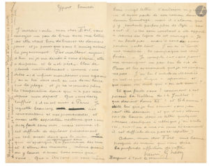 On joint 4 L.A.S. : –29 juillet 1921, à Mme Théo van Rysselberghe (la Petite Dame) qui vient de perdre sa mère, belle lettre de condoléances ; – Maison Neuve 1er octobre 1934, à Mme Paul-Albert Laurens, longue lettre de condoléances et d’espérance spirituelle, à la mort du peintre Paul-Albert Laurens, évoquant leur ami Gide ; – 30 novembre et 20 décembre 1939, à Max Fischer, directeur littéraire chez Flammarion, au sujet de ses ouvrages sous contrat et à venir et de rééditions (L’Homme né de la guerre :Témoignage d’un converti, Saint Vincent Ferrier, et son livre de poèmes Foi en la France….