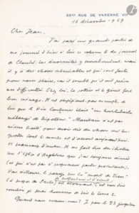 Julien GREEN (1900-1998). L.A.S. « Julien », 16 décembre 1969, à Jean Denoël ; 1 page et demie in-8 à son adresse 52 bis, rue de Varenne, VIIe, enveloppe.