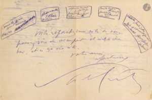 Lettre avec dessin au sujet de la décoration de son théâtre [Guitry va prendre la direction des Mathurins]. Guitry demande au dessinateur Ibels de « trouver les signatures autographes dont j’ai besoin pour la frise de mon théâtre que j’ouvre en Octobre » et de « les faire agrandir, en une quinzaine de jours, pas plus ». Il fait la liste de plus d’une vingtaine d’auteurs dramatiques, de Racine et Corneille jusqu’à Jules Renard. Et il dessine « le plan de la frise », où les noms des auteurs s’inscrivent en 5 médaillons formant une sorte d’arche…