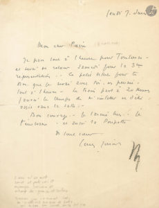 Brasseur jouait le rôle de Goetz. Jouvet doit partir pour Toulouse [voir Maurice Sarrazin et sa compagnie du « Grenier de Toulouse » pour le conseiller et l’encourager]. Il ne rentrera que le surlendemain pour la 3ème représentation. « Ce petit billet pour te dire que je serai avec toi, en pensée, tout à l’heure. Le train part à 20 heures j’aurai le temps de m’installer et d’être assis dans la salle ». [Jouvet mourra le 16 août.]