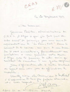 On joint : – une L.S. de Gaston Gallimard à Montherlant, 25.I.1923, au sujet d’un projet de contrat (en-tête Éditions de la Nouvelle Revue Française) ; – une l.a.s. d’un ami à Montherlant, 10.XII.1942, après la première de La Reine morte ; – une l.a.s. de Jean Meyer, 28 juillet 1973, au sujet des répétitions de Port-Royal.
