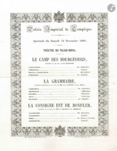 Programme du dernier spectacle au Théâtre Impérial de Compiègne, spectacle du 13 novembre 1869, par le Théâtre du Palais-Royal. Engagement de Mlle Bertile Leblanc par les Théâtres Impériaux de...