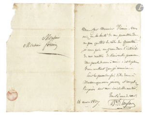 On joint : – une amusante L.AS. de Firmin à Mme Margueritte (la comédienne Minette, du Vaudeville), le Coudray 19 juillet [1834 ?] (1 p. ½ in-8, adr.) ; – et 2 L.S. collectives par Taylor et les membres du Comité de l’Association des Artistes dramatiques (en-tête), 1844-1850.
