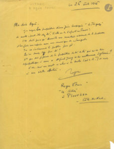 Roger VITRAC (1899-1952). L.A.S., Plourhan (Côtes du Nord) 26 août 1946, à Agnès Capri ; 1 page in-4 sur papier jaune.