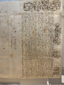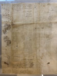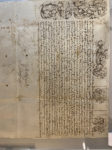 peau de vélin (330 x 270 mm) décoré en marge, mis sous plexiglas. Le mariage entre le Marquis de Poudenas et Jeanne François de Gillet de Lacaze a eu lieu à la paroisse de Saint Projet de Bordeaux dont ils sont originaires. Le document fulminé à l'Officialité de Bordeaux le 10 février 1756 dispense les parties de l'empêchement dû à la parenté au troisième degré de consanguinité. Pliures et petits accidents.