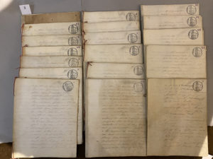 [JOUY]. Manuscrit : « Vente de la manufacture de toiles peintes de Jouy [...] », Paris 24 juillet 1845 ; environ 144 feuillets in-4° en 19 cahiers de peau de vélin chiffrés de A-S2, timbres fiscaux. Expédition de l'acte de vente de la...