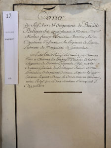 [VEXIN - BOIVILLE]. « Terrier du fief, terre & seigneurie de Boiville Belleperche appartenant à Messire Nicolas François Ternisien Chevalier, ancien Capitaine d'infanterie au Régiment de Béarn, relevant du Marquisat de Gamaches. Ledit terrier...