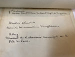 marquise d'Hugon, avec une cinquantaine de signatures, dont l'impératrice « Eugénie comtesse de Pierrefonds », Ph. Pétain, gal Buat, Winston Churchill, A. Millerand ; Alfonso XIII avec Victoria Eugenia et leurs enfants Jaime, Beatriz et Maria Cristina ; etc.