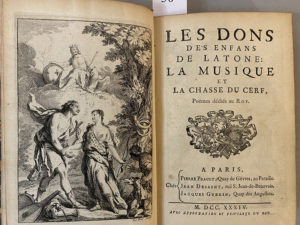[SERRÉ de RIEUX (Jean de)]. Les Dons des Enfans de Latone : la Musique et la Chasse du Cerf. Poëmes. A Paris, Chez Pierre Prault, Jean Desaint & Jacques Guérin, 1734. Petit in-8°, veau, triple filet doré encadrant les plats, dos lisse orné à...