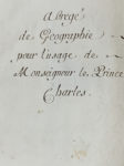 l'époque). Cours de géographie manuscrit calligraphié accompagné de 28 cartes gravées, destiné à l'éducation du Prince Charles de Lorraine, frère de François III de Lorraine (1708-1765), duc de Lorraine en 1729 puis empereur du Saint Empire en 1745. Certaines planches sont aquarellées au trait. Reliure très accidentée ; plusieurs feuillets et cartes accidentés ; l'atlas a par ailleurs servi d'herbier ce qui a occasionné de nombreuses taches. ÉMOUVANT EXEMPLAIRE DU PRINCE Charles de LORRAINE (1712-1780), DUC DE Lorraine proprio motu en 1736, PORTANT SA SIGNATURE D'ENFANT EN PAGE DE GARDE & LE CHIFFRE COURONNÉ de Léopold III , son père.