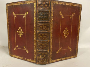 Diane ou Le Triomphe de l'amour Poëme. A Paris, Chez J. P. Costard, 1770. 3 ouvrages en un volume in-8°, maroquin rouge, double encadrement de roulette dentelées dorée ornant les plats, fleuron au centre, dos à nerfs orné, tranches dorées (reliure italienne de l'époque). • & •• Un titre orné et quatre planches gravés d'après Charles EISEN. ••• Un titre orné et trois planches gravés d'après MARILLIER. Mors frottés. EXEMPLAIRE EN MAROQUIN ROUGE.