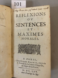 [La ROCHEFOUCAULD (François, duc de)]. Reflexions ou sentences et maximes morales. A Paris, Chez Claude Barbin, 1665. In-12, basane, dos à nerfs orné (reliure de l'époque). à12, é12, A-F12. Contrefaçon publiée un an après l'originale. De la...