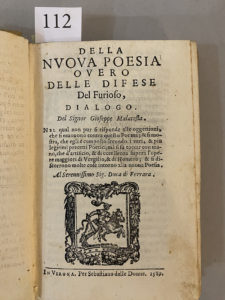 MALATESTA (Gioseppe). Della Nvova Poesia overo delle difese del Furioso, dialogo. Vérone, Per Sebastiano dalle Donne, 1589. In-12, vélin ivoire, dos à nerfs (reliure du XVIIe s.). Vignettes de l'éditeur sur le premier et le dernier feuillet ;...