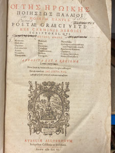 nerfs orné (reliure fin XVIIe s.). Anthologie de poètes grecs dont Homère, Hésiode, Orphée, Callimaques, Aratos de Soles, Nicandre de Colophon, Théocrite, Pythagore, Apollonios de Rhodes, Oppien de Corycos, etc. Texte bilingue grec et latin. Marque d'imprimeur sur le titre ; lettrines. Coiffes accidentées ; quelques épidermures ; ex-libris manuscrit caviardés sur le titre & p. 1 du t. II ; quelques mouillures marginales dans le t. I.