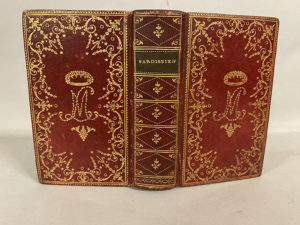 » surmontée d'une couronne florale au centre, dos lisse orné, tranches dorées (reliure de l'époque). Manque le dernier feuillet. BEL EXEMPLAIRE EN MAROQUIN ROUGE ORNÉ D'UNE DENTELLE AUX PETITS FERS & DU CHIFFRE « L M ».