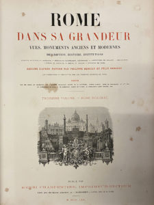 premier plat, armoiries dorées au centre et aux angles, encadrement à froid ornant le second plat, dos à nerfs orné des armoiries papales (H. Charpentier fils, Nantes). ÉDITION ORIGINALE. • « Rome antique », •• « Rome chrétienne » & ••• « Rome moderne ». 100 planches lithographiées sur fond teinté, dont un plan (28+34+38) ; vignettes dans le texte. Quelques frottements aux mors ; rousseurs et quelques décharges. BON EXEMPLAIRE COMPLET AUX ARMES du pape PIE IX.