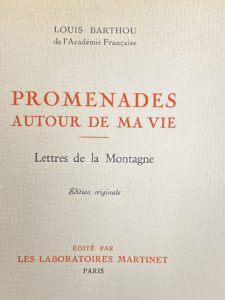 BARTHOU (Louis). Promenades autour de ma vie. Lettres de la Montagne. Paris, Édité par Les Laboratoires Martinet, s. d. [1933]. In-8° broché, non rogné. ÉDITION ORIGINALE. Tiré à 500 exemplaires sur hollande van gelder et quelques-uns hors...
