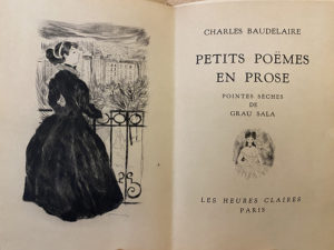BAUDELAIRE (Charles). Petits Poëmes en prose. Paris, Les Heures Claires, s. d. [1948]. 3 volumes (dont un pour les suites) in-12 en feuilles, sous couvertures rempliées. Pointes-sèches par GRAU SALA. Tiré à 391 et quelques exemplaires, celui-ci...