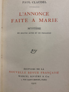 CLAUDEL (Paul). L'Annonce faite a Marie. Mystère en quatre actes et un prologue. Paris,Éditions de la Nouvelle Revue Française, Marcel Rivière & Cie, 1912. Grand in-12, demichagrin brun, dos à nerfs, couverture conservée (Thierry). ÉDITION...