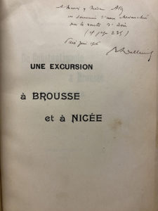 DELBEUF (Régis). De Constantinople à Brousse et a Nicée. Constantinople, 1906. In-8°, demichagrin brun à coins, dos à nerfs orné, tête dorée, couverture conservée (reliure de l'époque). ÉDITION ORIGINALE. ENVOI DE L'AUTEUR à Monsieur et...