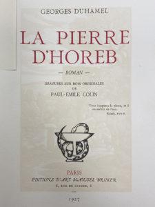 DUHAMEL (Georges). La Pierre d'Horeb. Roman. Paris, Éditions d'Art Manuel Bruker, 1927. In-4° broché. Bois par Paul-Émile COLIN. Tiré à 416 exemplaires, celui-ci (n° 332), signé par l'éditeur, un des 300 sur vélin d'Arches. JOINT :...