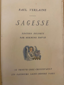 VERLAINE (Paul). Sagesse. Paris, Se trouve chez Creuzevault, s. d. [1943]. In-8° broché, couverture illustrée rempliée. Illustrations, certaines en couleurs, par Hermine DAVID. Tiré à 550 et quelques exemplaires, celui-ci (n° 32), UN DES 50 DE...