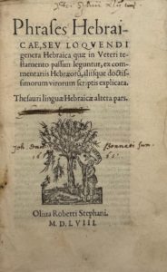 Robert Estienne, 1558. In-8, vélin souple à recouvrements, dos lisse, traces d'attaches (Reliure de l'époque).Édition originale de ce volumineux dictionnaire des expressions idiomatiques de l’hébreu biblique établi et préfacé par Robert Estienne (1503-1559). Renouard l'attribue à son fils Robert II et le croit imprimé à Paris. Marque à l’olivier sur le titre à la devise Nolis altum sapere (Heitz, n°89 ; Schreiber, n°12).