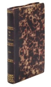 Paris, Adrian Tiffaine, 1616. Petit in-12, demi-chagrin violet, dos lisse orné de larges faux-nerfs dorés (Reliure du XIXe siècle).Très rare traduction juxtalinéaire d’un des chefs-d’œuvre du roman picaresque. C’est une des toutes premières traductions françaises de la première partie seule, qui semble reprendre celle de Bonfons parue en 1601.