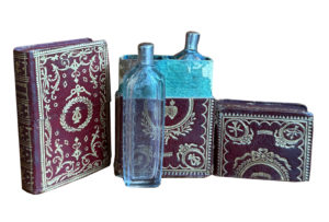 L'Année heureuse. In-18 (100 x 55 x 20 mm), maroquin rouge décoré aux petits fers dorés, attributs amoureux aux angles, médaillon central contenant deux cœurs ardents au premier plat, et la mention « Son cœur est le mien » au second, dos lisse titré, intérieur garni de soie bleue. Contient deux fioles en verre à bouchon métallique. Fond détaché, accidents et manques.