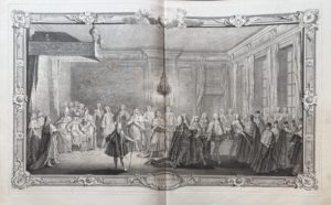 Le texte, composé par Antoine Danchet et publié sous la direction de l’abbé Jean-Paul Bignon et de Claude Gros de Boze, occupe 34 ff. gravés, ornés de riches bordures, cartouches et fleurons, y compris la table à double page.