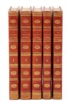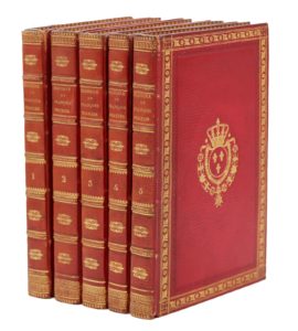 Paris, J.-L.-F. Foucault, 1819. 5 volumes in-8, maroquin rouge à long grain, roulette dorée sertie de filets et d'une roulette à froid, armoiries au centre, dos orné, dentelle intérieure, tranches dorées (Simier r. du roi).Quatrième édition, ornée d'un portrait-frontispice gravé par Leroux d'après Titien. La première date de 1766-1769.