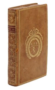 Paris, Michel Lambert, 1777. 2 parties en un volume in-12, veau blond, triple filet, armoiries au centre, dos lisse orné, dentelle intérieure, tranches dorées (Reliure de l'époque).Unique édition de ce rare mémoire sur l'imposition des tailles dans la généralité de Lyon, avec six tableaux repliés en fin de volume.