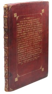 Lyon, [ca. juin 1695]. Manuscrit de [46] ff. maroquin bordeaux, grand titre doré couvrant le plat supérieur encadré de filets dorés avec fleurons aux angles et aux écoinçons, dos orné, roulette sur les coupes, tranches dorées (Reliure de l'époque).De la bibliothèque Chandon de Briailles, avec ex-libris.