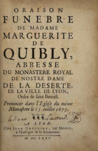 [POLLA (Pierre)] — Oraison funèbre de Madame Marguerite de Quibly, abbesse du monastère royal de Nostre Dame de la Déserte, de la ville de Lyon.