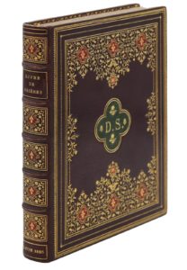 1886. In-8 carré (170 x 135 mm), maroquin aubergine, roulette, filets et pointillés dorés en encadrement, frises dorées et mosaïquées encadrant un médaillon central quadrilobé et mosaïqué frappé du chiffre de D. S., dos orné, filets dorés sur les coupes, dentelle intérieure, doublures et gardes de soie prune, doubles gardes de soie argentée, tête et queue dorées, étui (Kauffmann & Maillard).Très rare et curieux spécimen de livre aux caractères tissés en noir sur soie argentée.