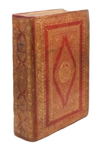 Lyon, Jacques Cardon et Pierre Cavellat, 1622. In-folio, maroquin rouge, important décor doré en encadrement, large rectangle central aux petits fers, armoiries dans un médaillon losangé au centre, dos lisse orné, tranches dorées, boîte moderne en chagrin rouge à fenêtre transparente (Reliure de l'époque).Édition originale rare de ce commentaire du Livre des Nombres par le jésuite français Jean Lorin (1559-1634), qui a laissé plusieurs volumes d'exégèse biblique.