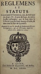 DRAPIERS — Reglemens et statuts, concernant le commerce, art & fabrique des draps, d’or, d’argent & de soyes, & autres etoffes mêlangées, qui se font dans la ville de Lyon & faux-bourgs d’icelle, & dans tout le Païs de Lyonnois.